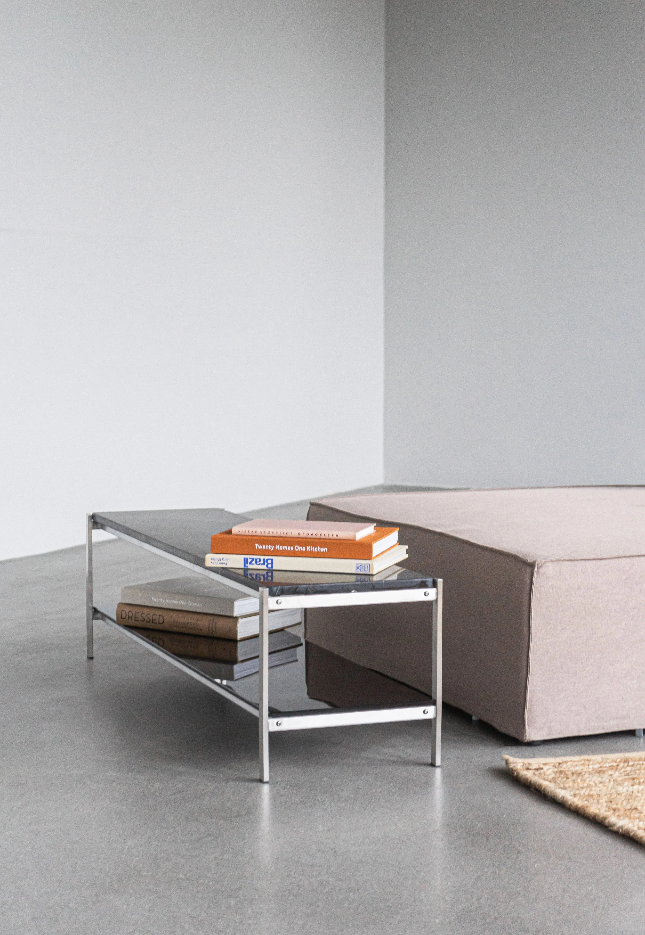 The frame is made from welded stainless steel that is assembled by umbraco bolts. The marble top sits directly on the frame and the frame design is holding the marble top in place without further assembly. The marble top is honed with with slightly rounded edges to give provide a smooth finish and a more durable top. The lower shelf is made from hardened glass in a smokey color. It is a beautiful and versatile piece of furniture.